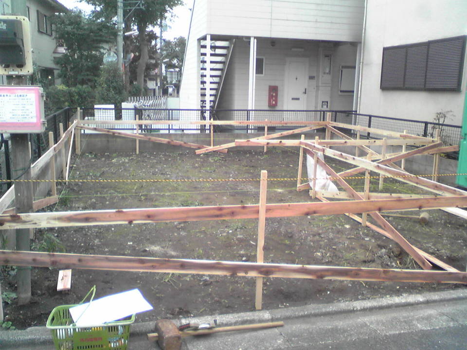 やり方作業とは、工事着手の前に、建物の正確な位置・高さ・水平などを決める作業のことです。ジェネシスでは、複数の現場監督たちでチェックしながら半日強かけて行っています。こちらは作業完了後の写真。