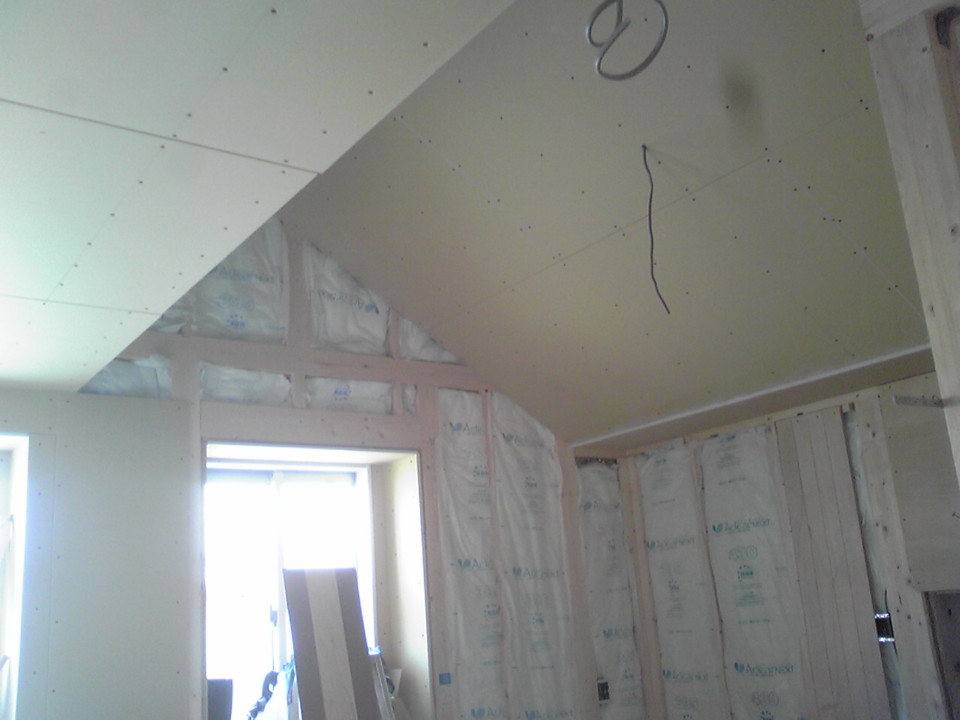 現在、石膏ボード施工中です。防火性と遮音に優れた材料で、また一歩ここちいい家に近づいてきました。この工程が終わると、お部屋の雰囲気も一気に掴みやすくなってきます。大工さん工事も、大詰めです。