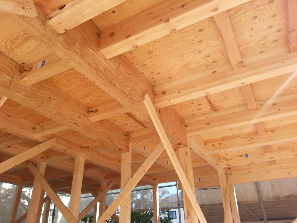 写真は1階の壁用の一部。大工さんと現場監督が力を合わせて運んでおります♪