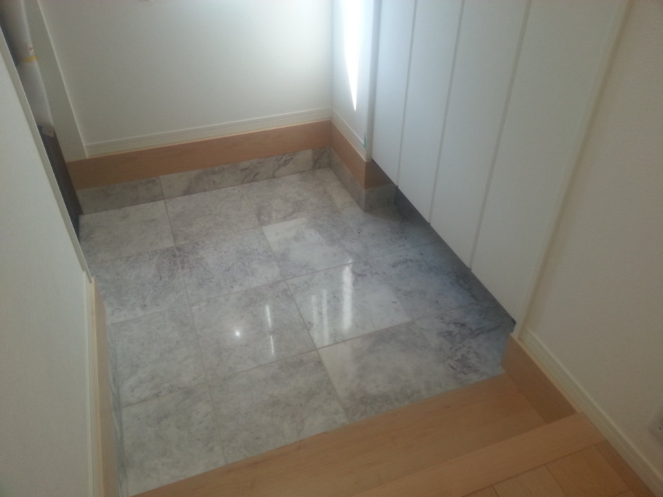 お客様のご希望にて玄関タイルを大理石(天然石)タイルを使用しました。