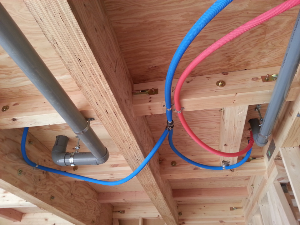 排水ルートについては、水道業者さんと大工さんとでしっかり打ち合わせし施工しています。1階の天井高さに影響を及ぼすので、どこの現場においても注意しなければならない工程です。