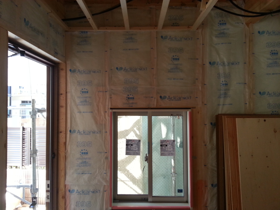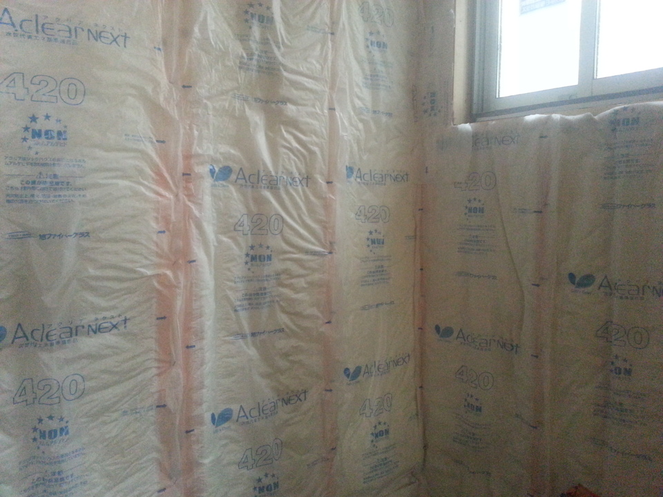 ユニットバスの施工が控えておりますので、先行でユニットバス部分(壁)の断熱材施工を先行しました。
