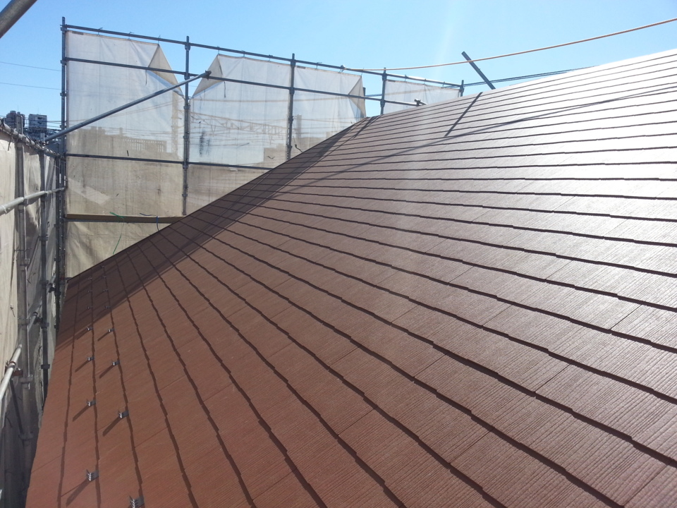 上棟後すぐにアスファルトルーフィング(防水の役割を果たし家に雨が侵入するのを防いでくれます)の施工を行い、その後、お客様が選ばれたコロニアル屋根材を施工します。