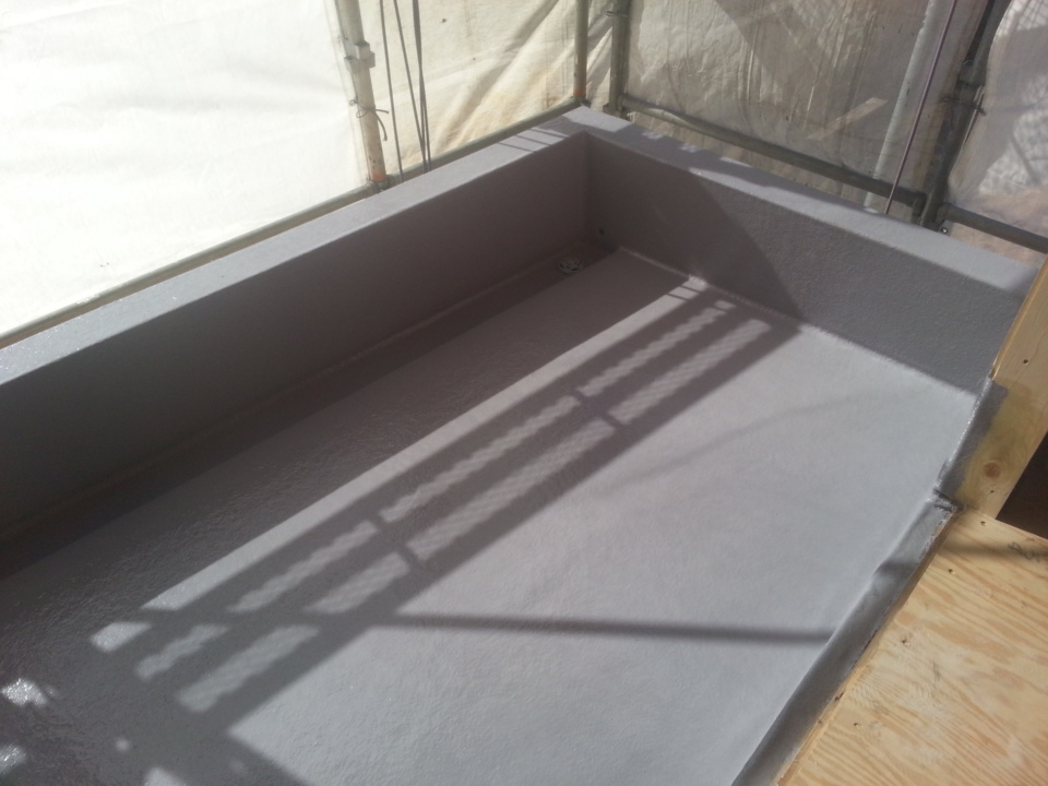 大工さんにより水勾配下地を作成し、FRPという特殊な膜を隙間なく塗ることで、雨漏りのないバルコニーに仕上がります。グレーの表面塗装はトップコート仕上げです。