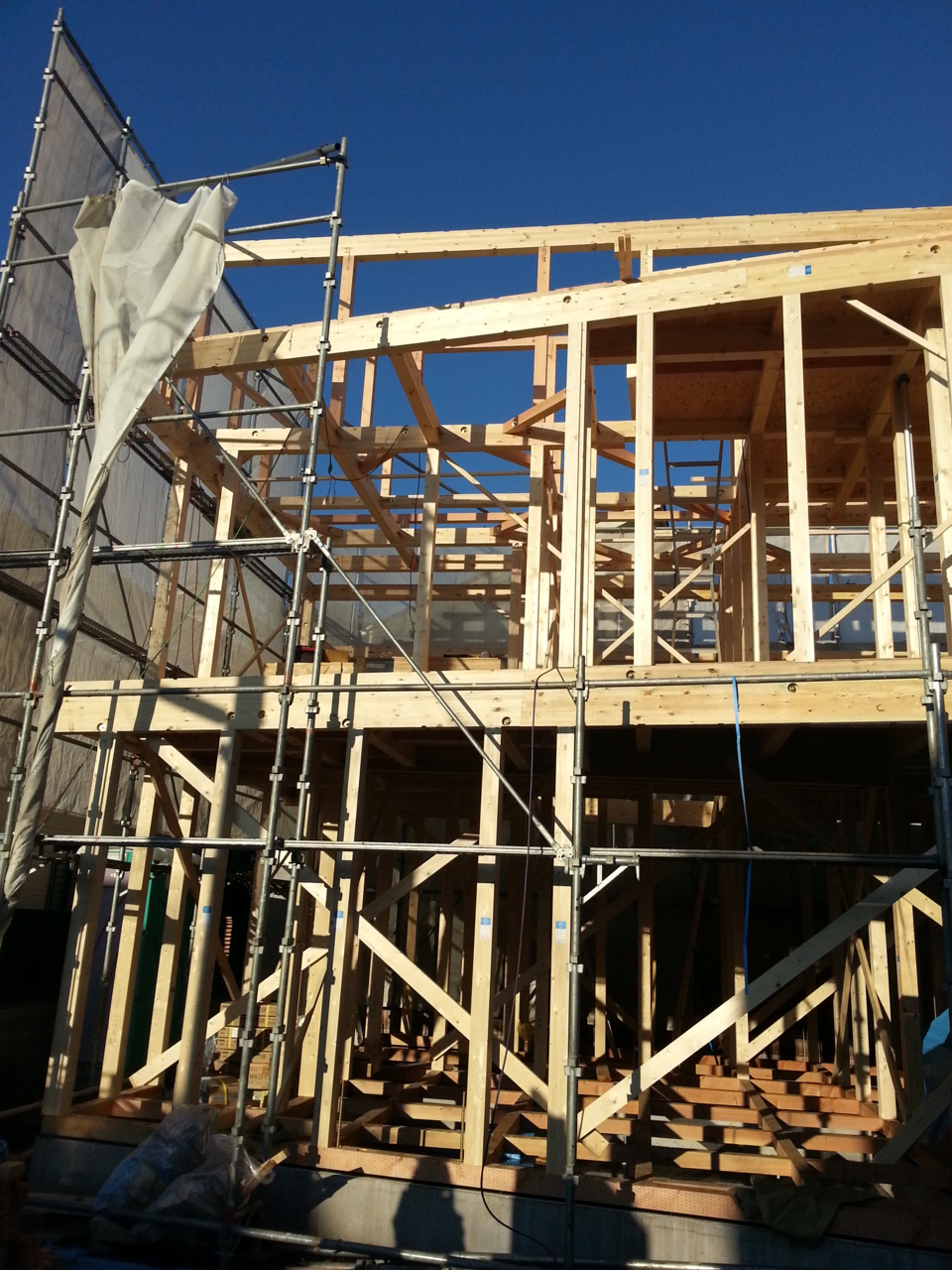 本日、上棟しました!安全第一に、現場監督や棟梁、大工さん達の複数名でワッセワッセと作業しています。