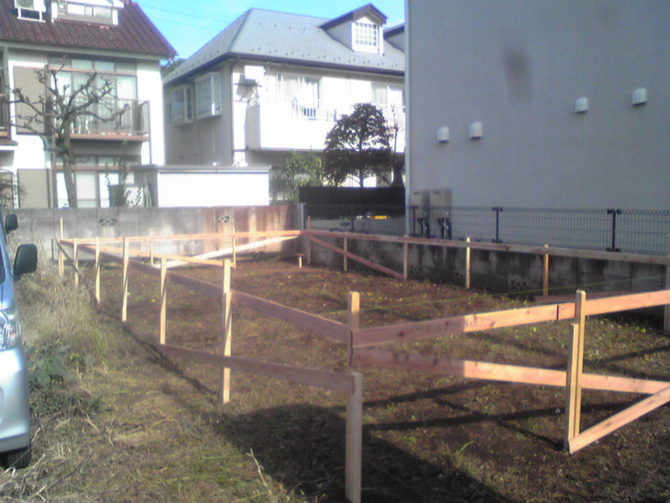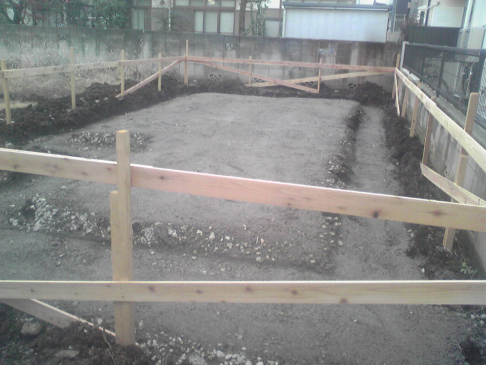 やり方作業とは、工事着手の前に、建物の正確な位置・高さ・水平などを決める作業のことです。ジェネシスでは、複数の現場監督たちでチェックしながら半日強かけて行っています。こちらは作業完了後の写真。