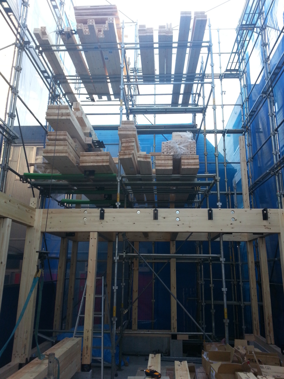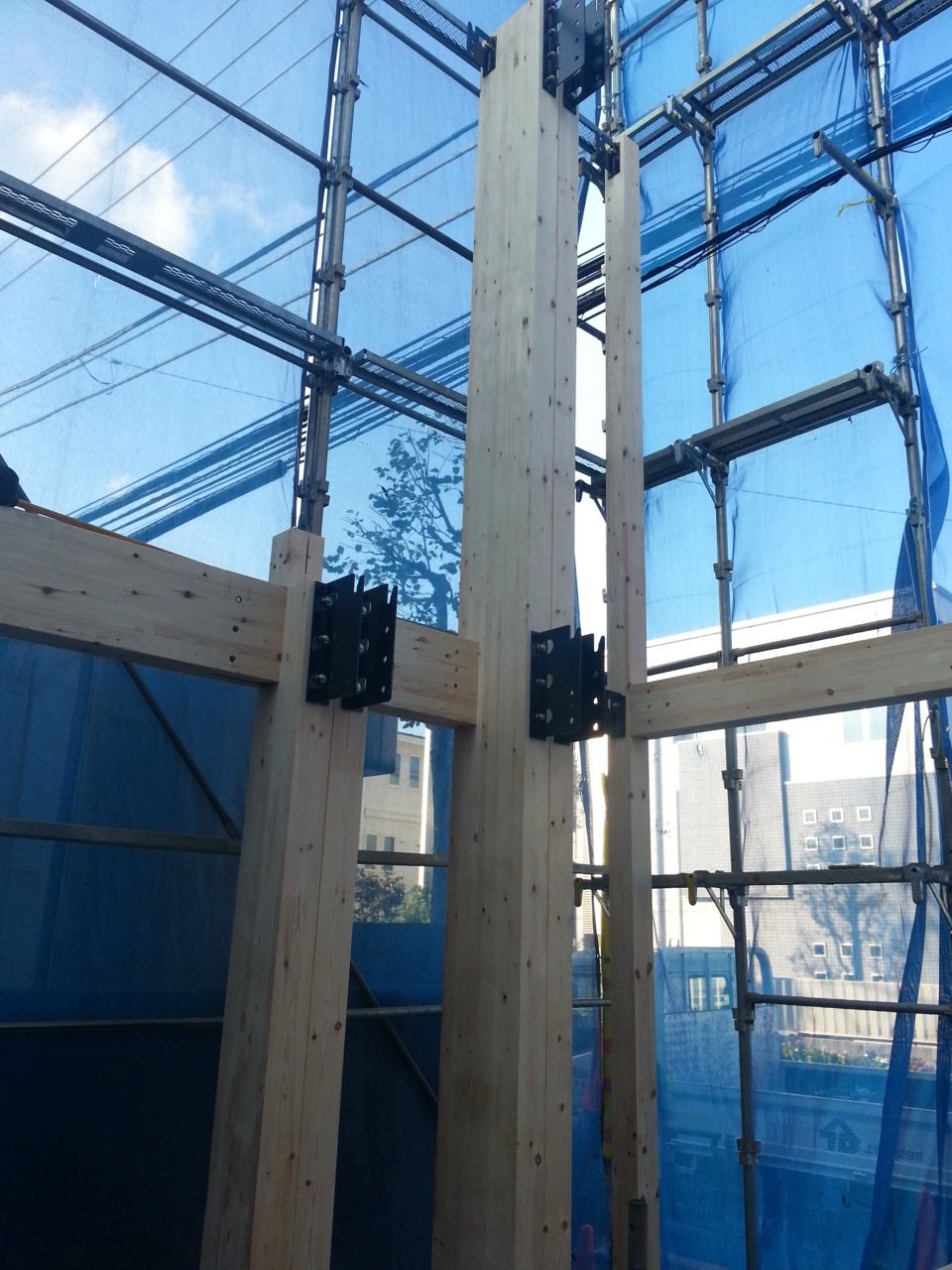 こちらの建物は、木造鉄骨のSE構法で建てられます。接合部に見えている黒いSE金物と特殊ボルトにより柱や梁そのものを互いに剛接合し、強固な構造躯体をつくり上げます!