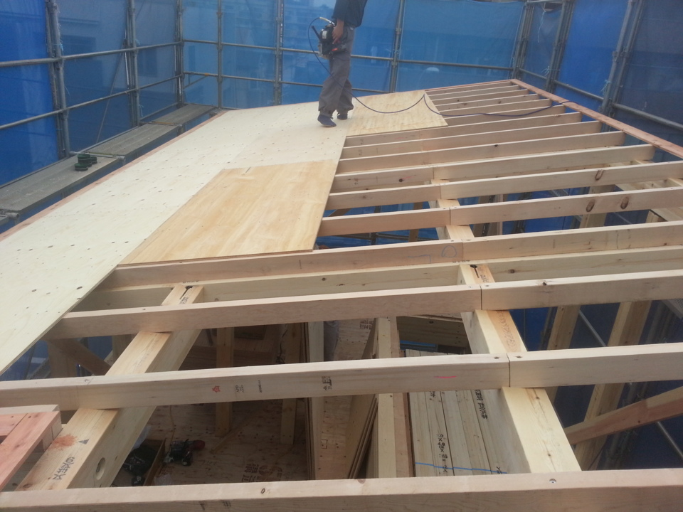 職人さんが固定状況を確認しながらサクサクと野地板を取り付けています!