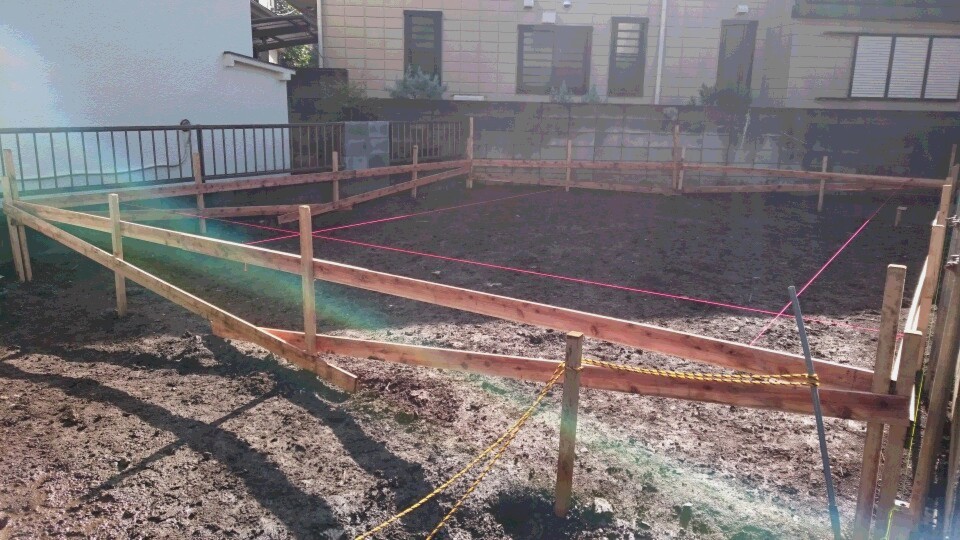 やり方作業とは、工事着手の前に、建物の正確な位置・高さ・水平などを決める作業のことです。ジェネシスでは、複数の現場監督たちでチェックしながら半日強かけて行っています。こちらは作業完了後の写真。