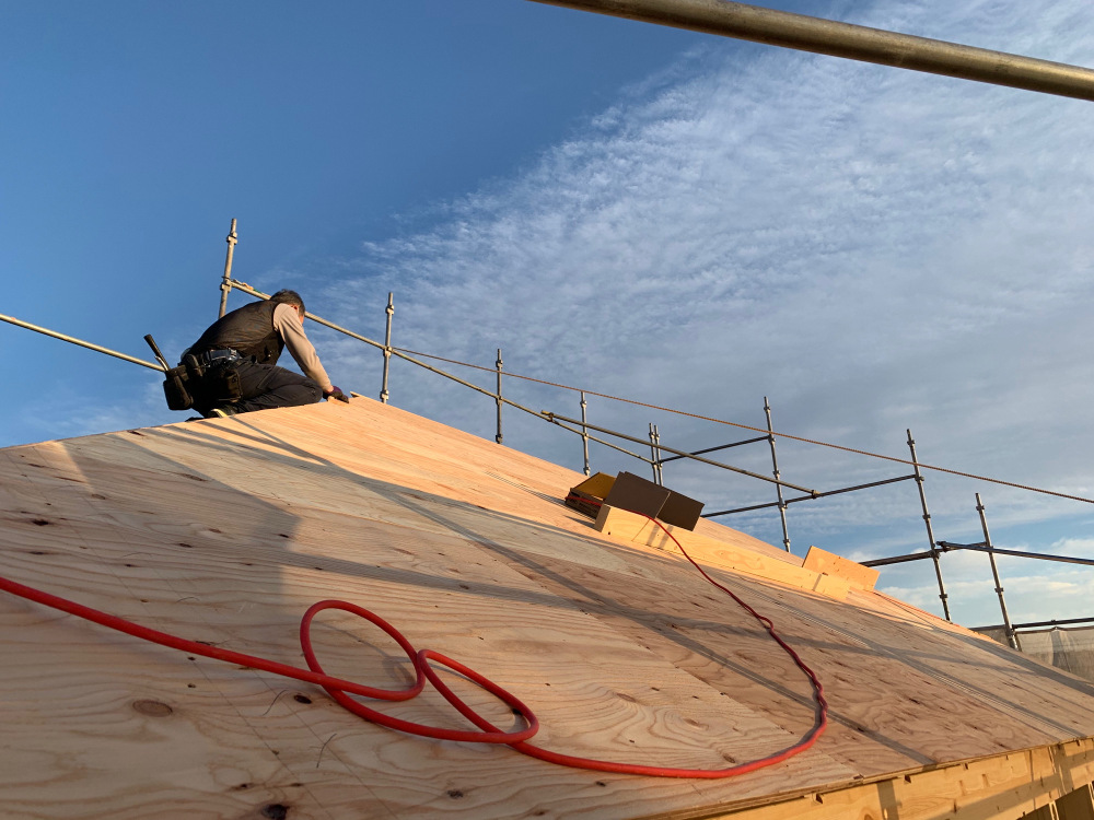 次はこの野地の上にルーフィング(防水シート)を貼ります。