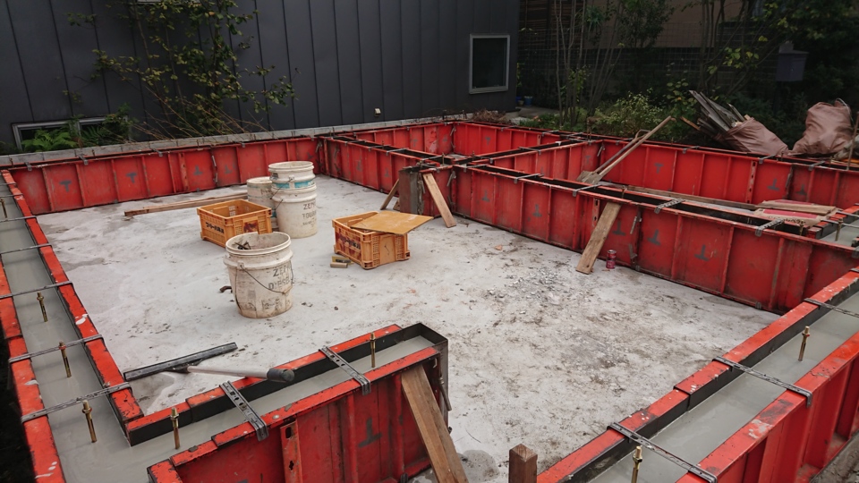 この部分のコンクリートの乾燥(養生)を待ち、今度は立ち上がり部分の生コン打設のための枠組みに移行いたします。
