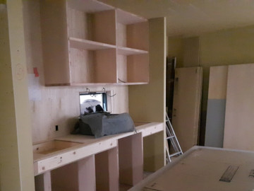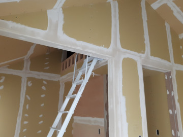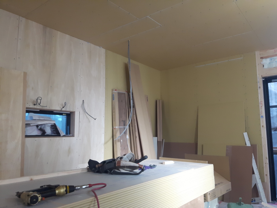 木工事が完了しますと、電気のコンセント関係ボート開口に入りクロス工事へと工程が進みます。