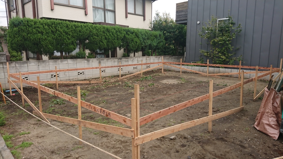 基礎工事着工前に我々現場監督により遣り方を掛けます。