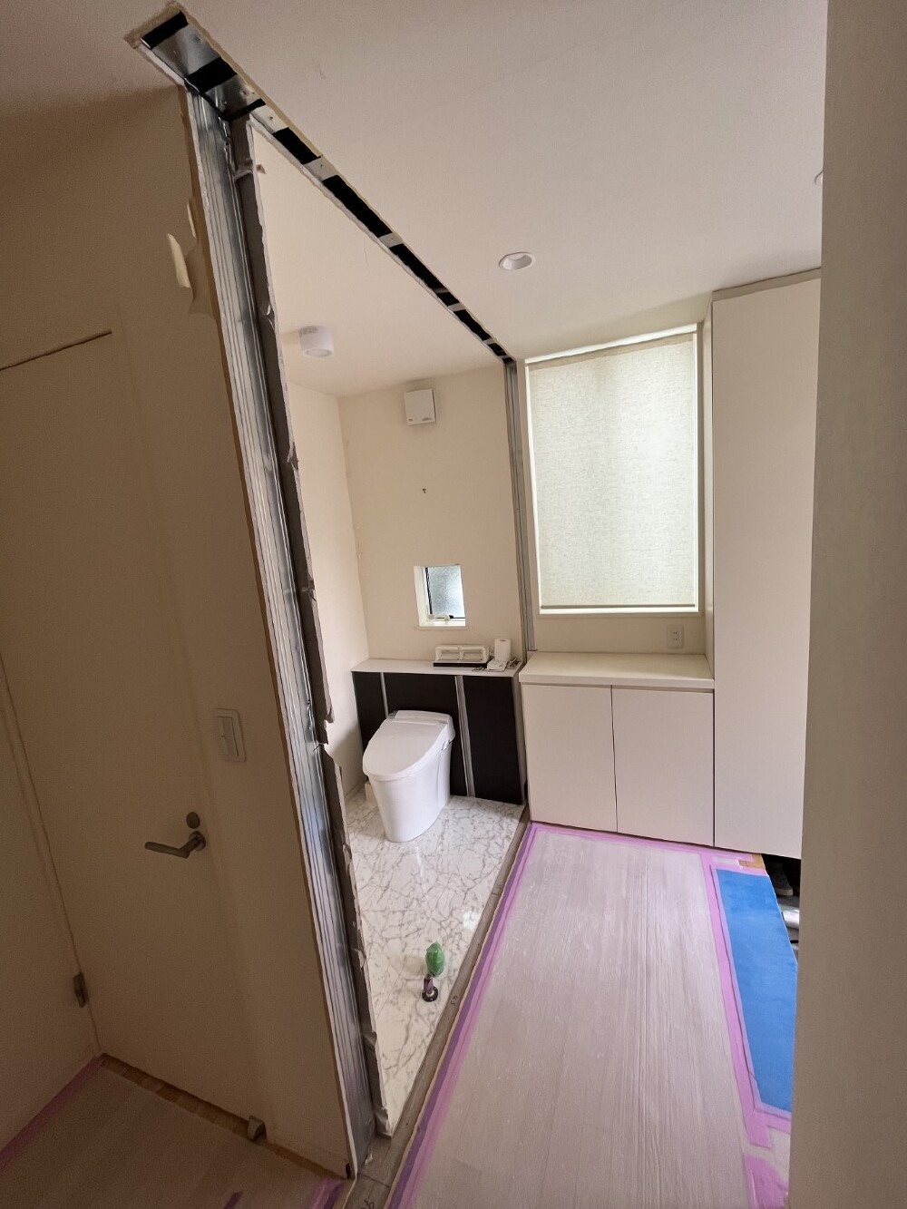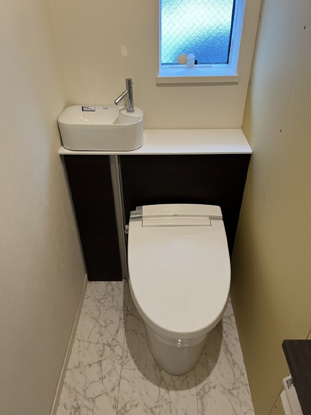 以前手前にあった手洗いは撤去したので、代わりにコンパクトタイプの手洗いを背面収納内に設置しました。