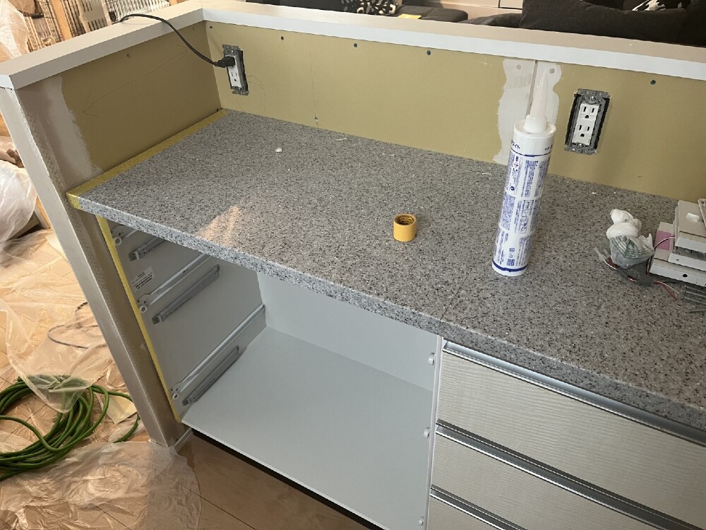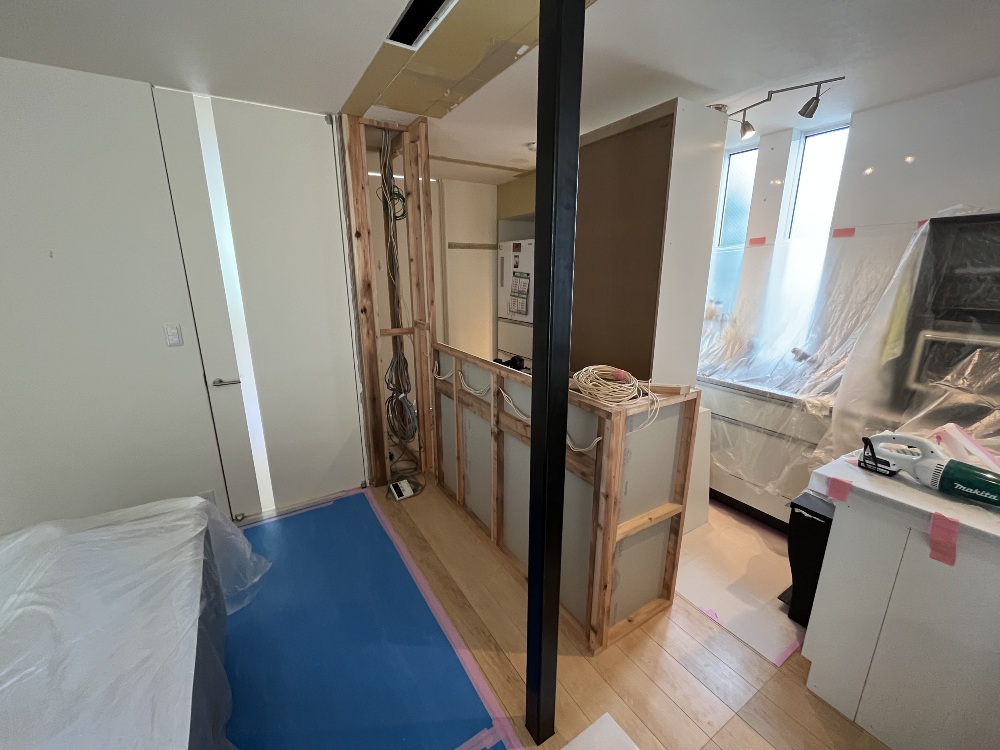 引き続き木工事中です。手前のキッチンカウンターも通路確保のために少しカットしました。