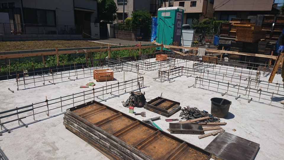 この盤の上に立上り部分の枠を組み、そこに生コンを打設する工程に移行します。