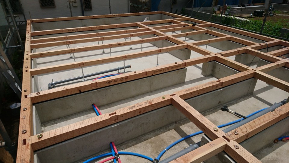 基礎工事が完了し、外部、基礎内部の先行配管工事をおこないました。