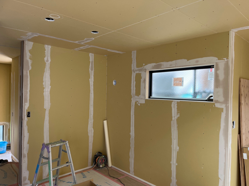 壁紙を貼る前に下地処理をまずします。石膏ボードの継ぎ目の部分にパテを埋めてペーパーをかけ段差が出来ないように平らにしておきます。