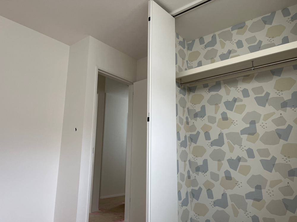 お子様のお部屋のクローゼット内のクロス施工中になります。