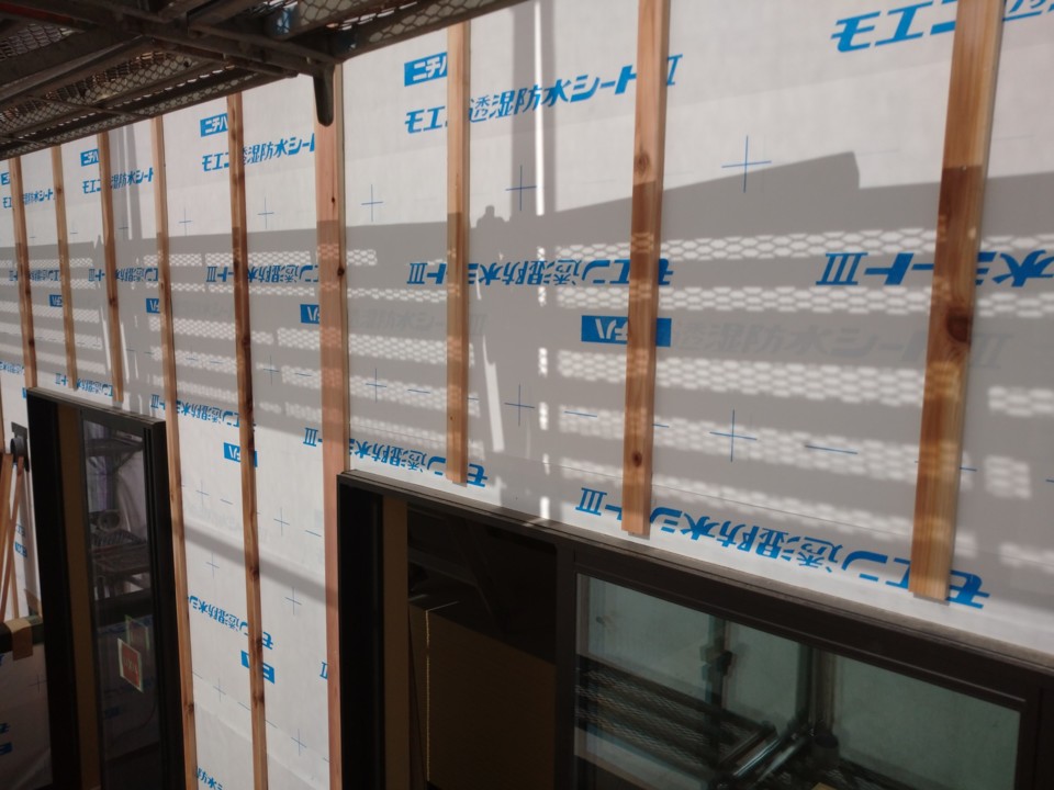 写真で写っている細い角材が胴縁と呼ばれる材です。