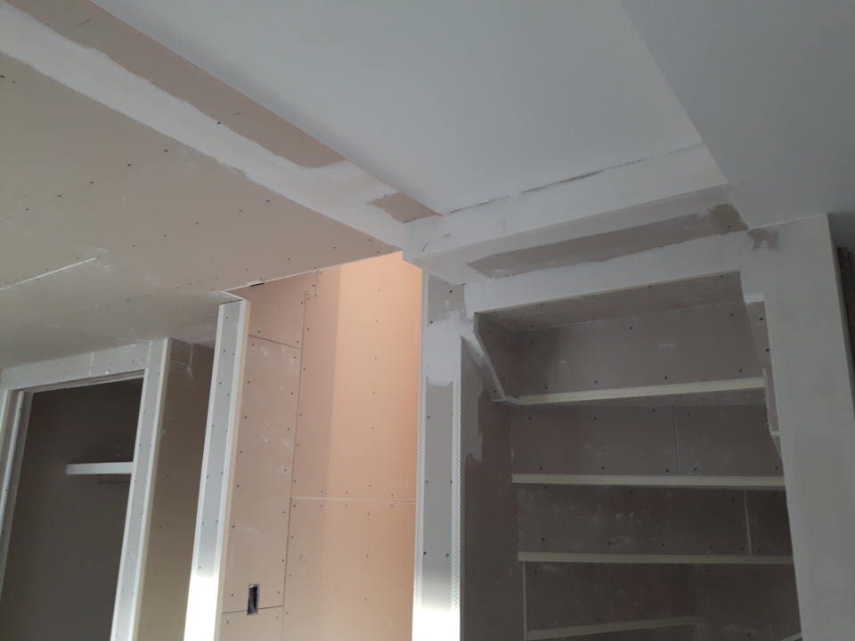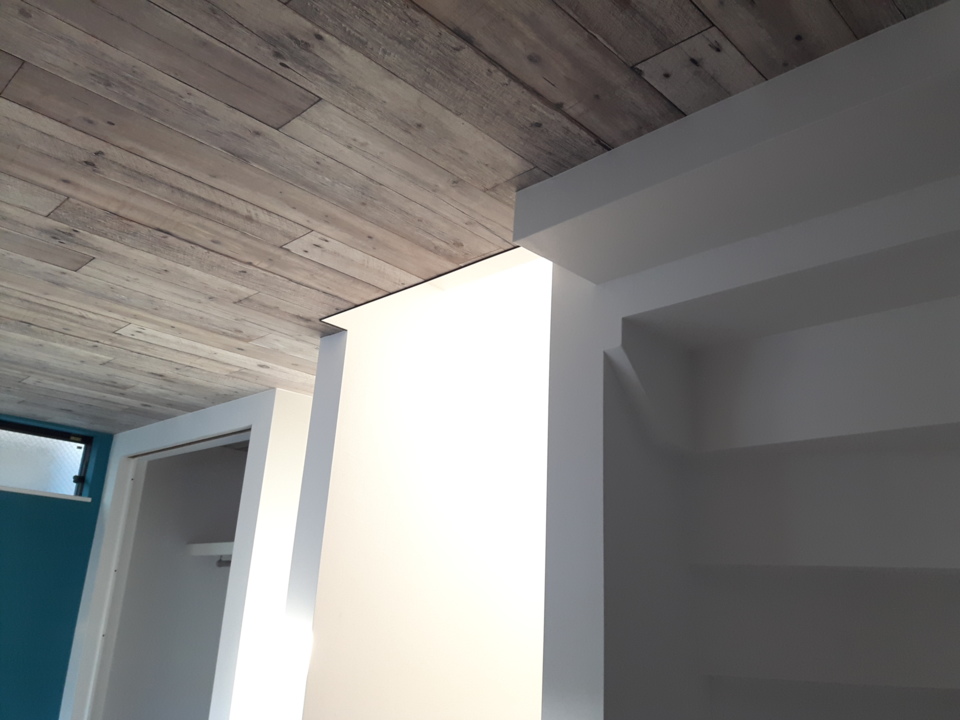 石膏ボードのジョイント・ビスの打ってある部分の下地処理(パテ)を行いクロスを貼っていきます。