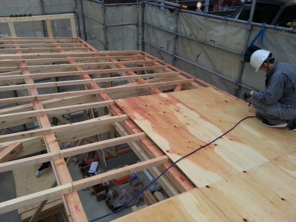 下地板は野地板と呼ばれています。構造用合板の厚さ12㎜を使用しています。
