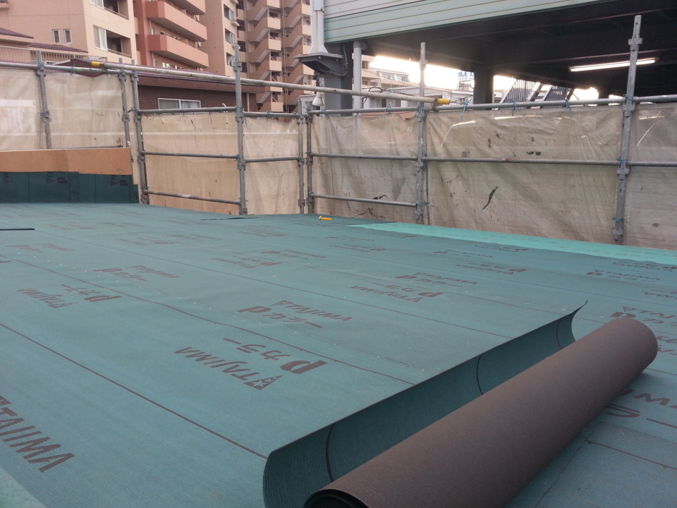 ルーフィングとは屋根の下地材(構造用ベニヤ)を施工した上に張り広げる防水シートのようなものです。