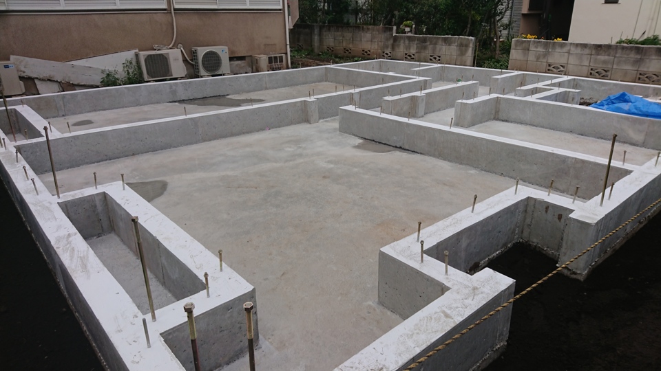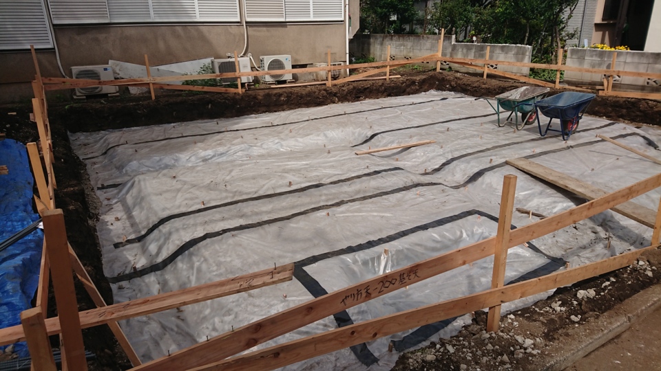 まずは敷地を基礎の形状に掘り進めて行く【根伐り】という工程があり、現在は捨てコンクリートの打設準備が完了したところです。