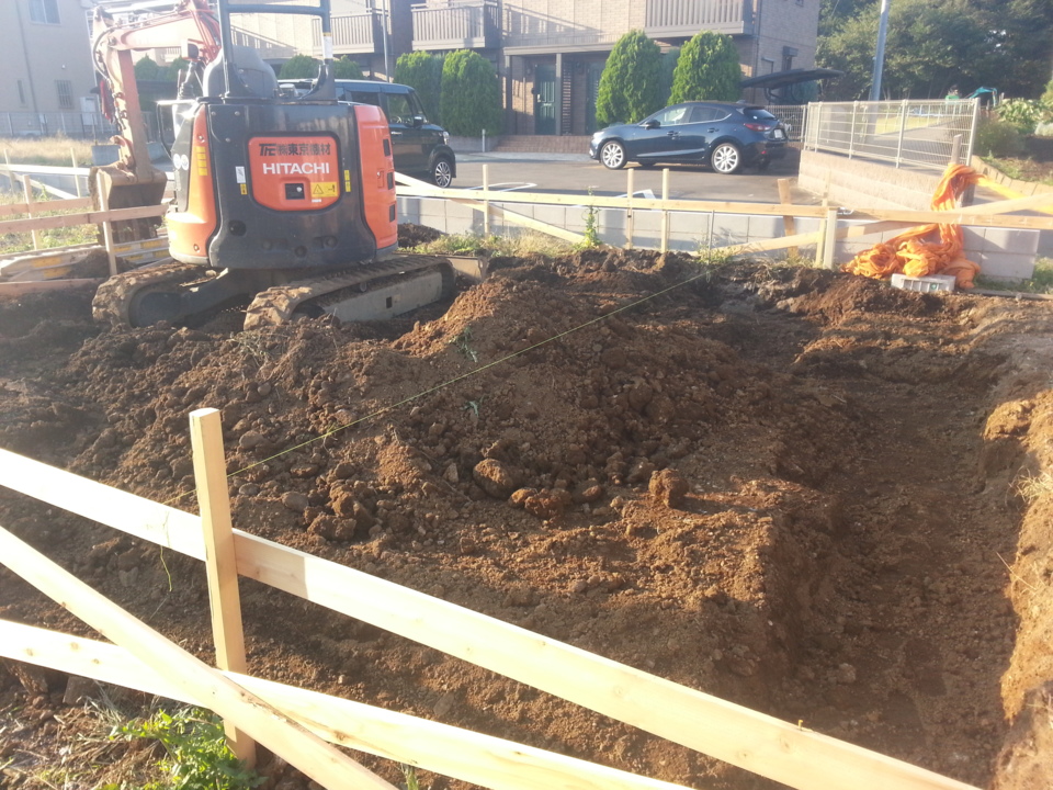 まずは重機を現場に持ち込み基礎(建物)の形状に添って根伐り(土を掘ること)をいたします。