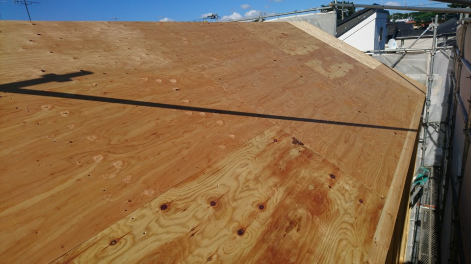野地板の完了後には雨漏りを防ぐルーフィング材の施工になります。