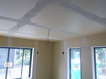 石膏ボードのジョイント・ビスの打ってある部分の下地処理(パテ)を行いクロスを貼っていきます。