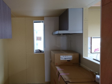 石膏ボードの施工が終わり、キッチンの取付に入りました。