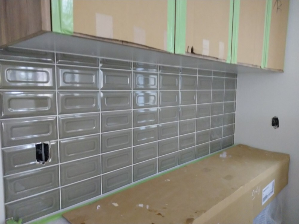 キッチン背面壁にタイルを貼りました。