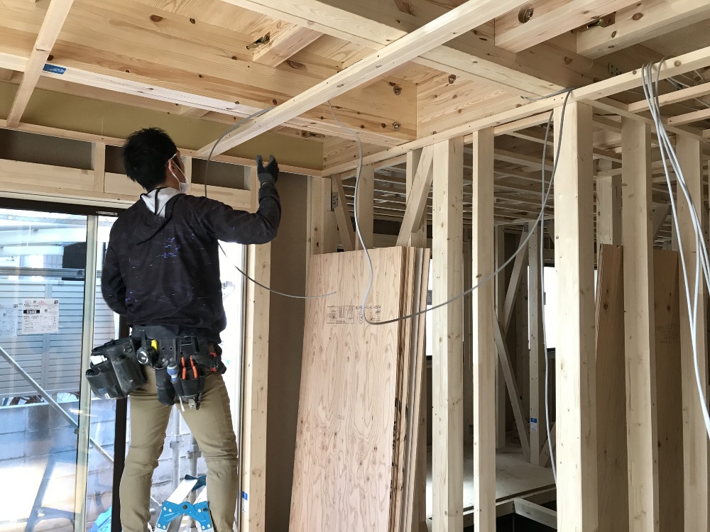 木工事と並行して電気配線の施工中です。