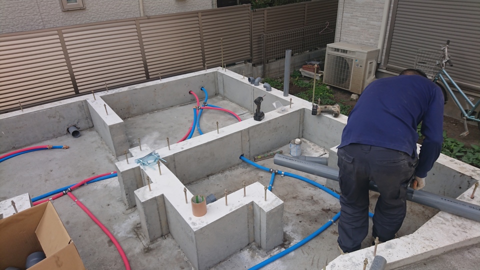 基礎工事完了後、最初に作業するのが、先行での配管稼業です。