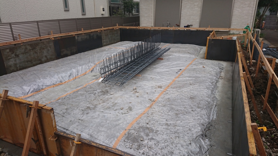 耐圧盤の上に基礎立上り部分の生コンを打設しますので、その枠組みをする工程です。