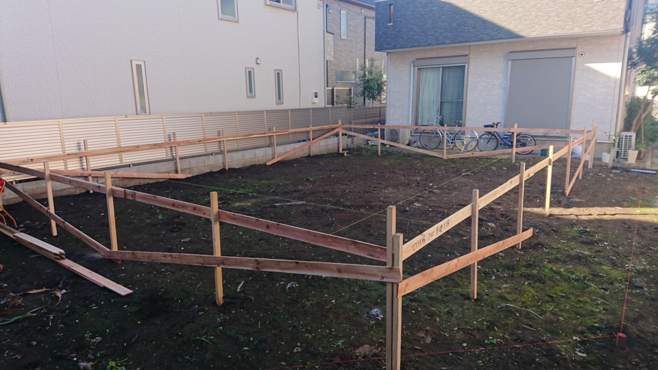 敷地に対する基礎の配置、基礎の高さや水平、直角などの情報をこの【遣り方】という囲いに示してあります。