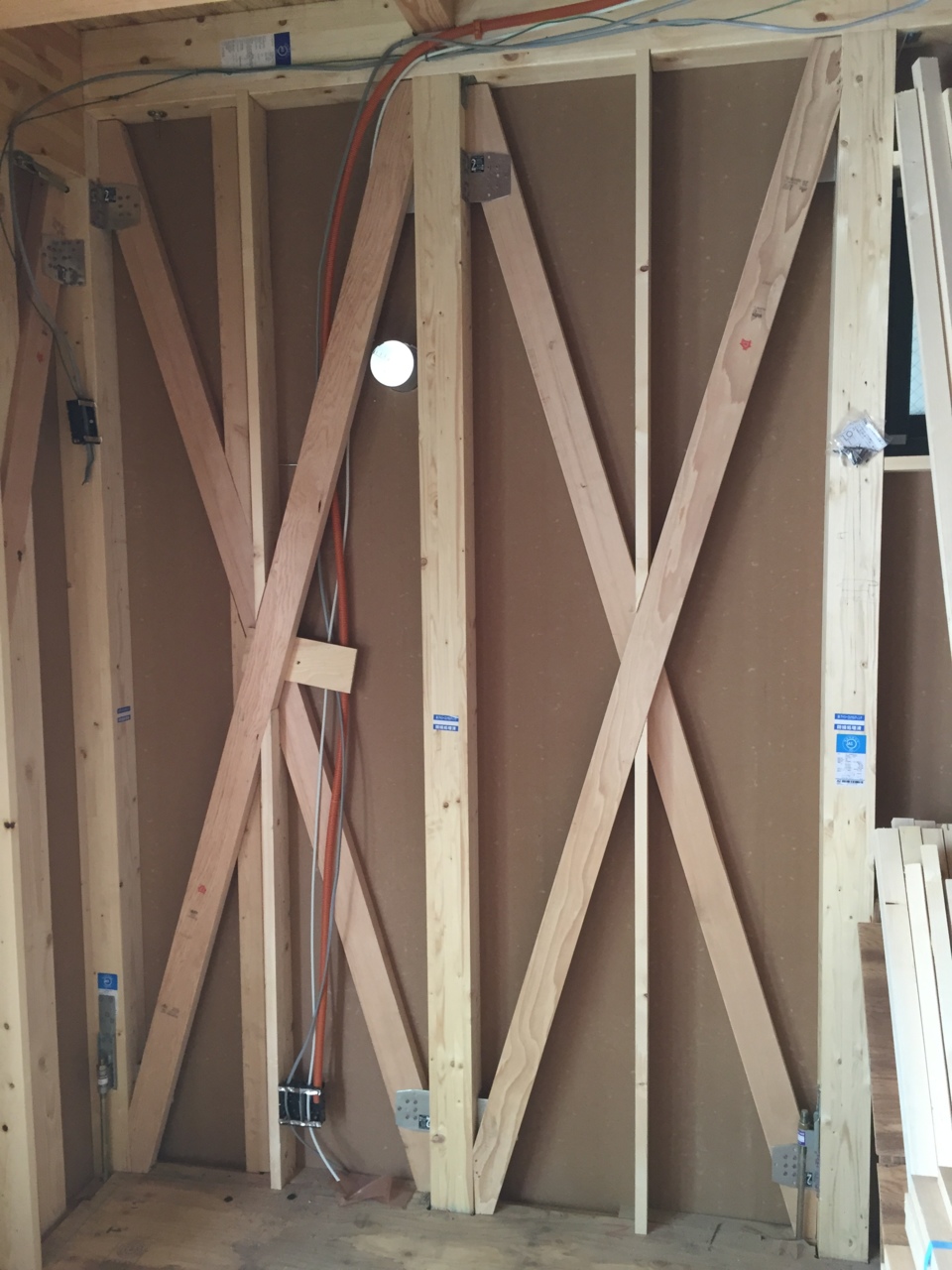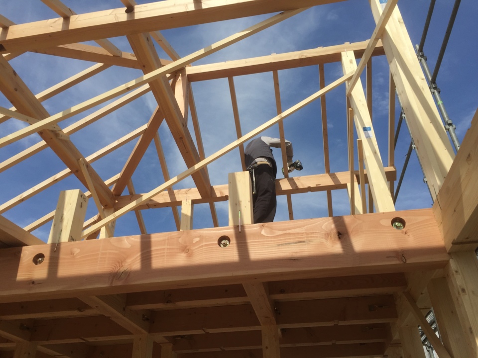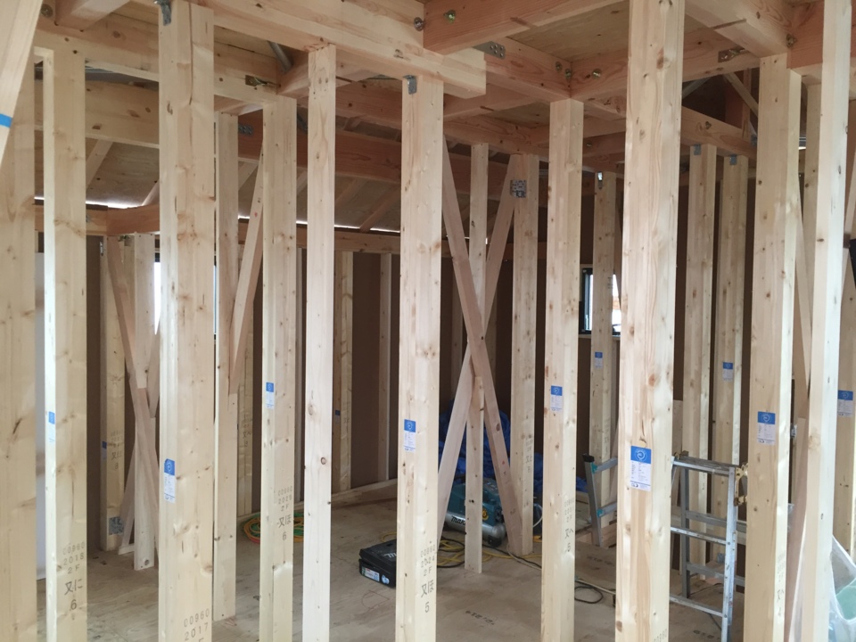 柱の位置や筋交い、金物の取付状況などが設計図どおりに配置されているかを、ひとつひとつ細かくチェックします。