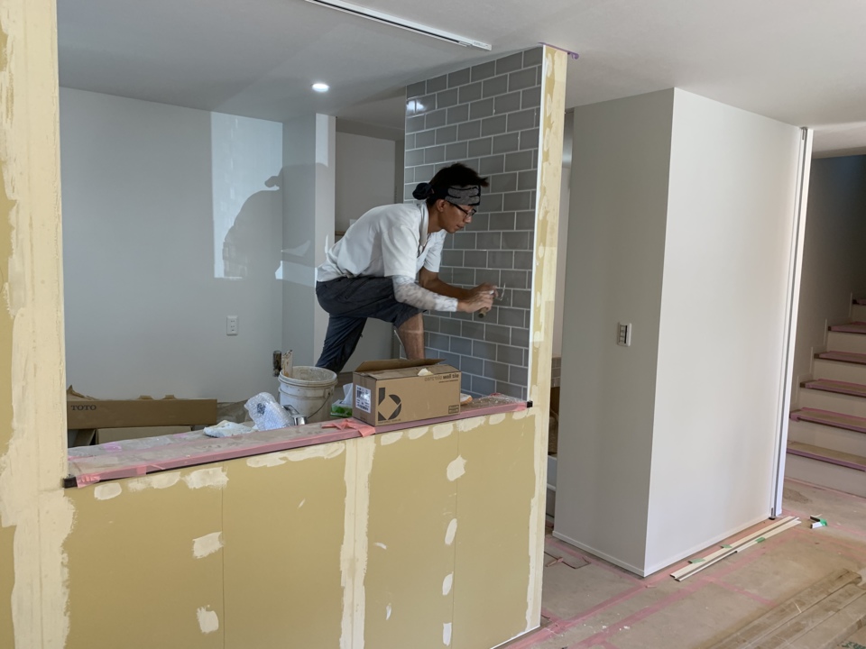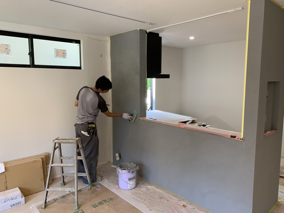 クロス作業がスタートしました。壁紙を貼る前に下地処理をします。