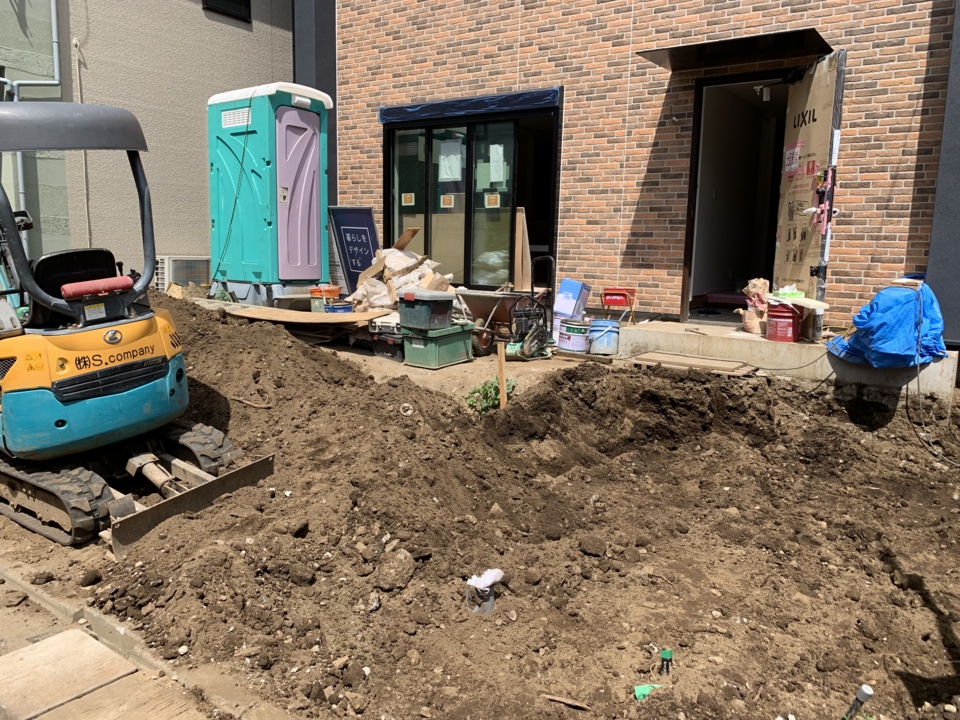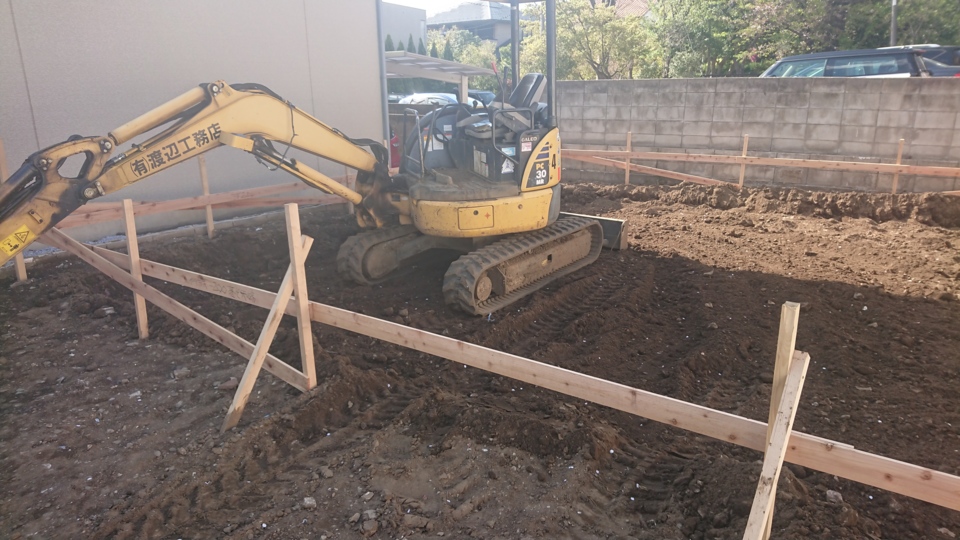 まず最初に重機にて遣り方を基に根伐りをおこないます。