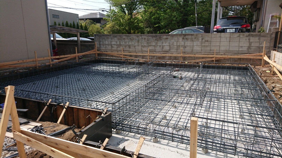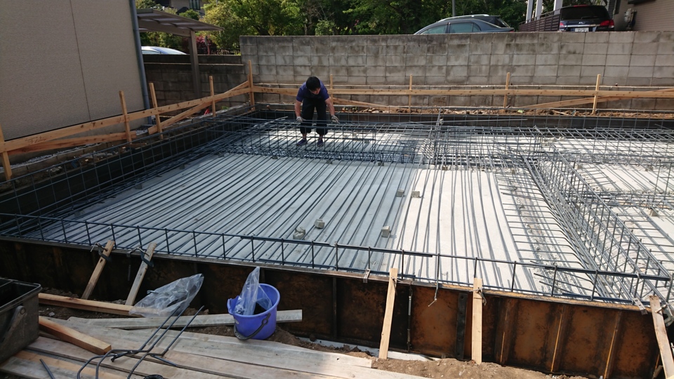 捨コンが乾き、枠を固定できたら鉄筋を配列していきます。