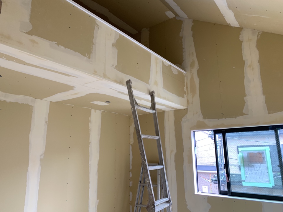 石膏ボードの繋ぎ目の部分にパテを埋めて、ペーパーをかけ段差ができないように平らにしておきます。