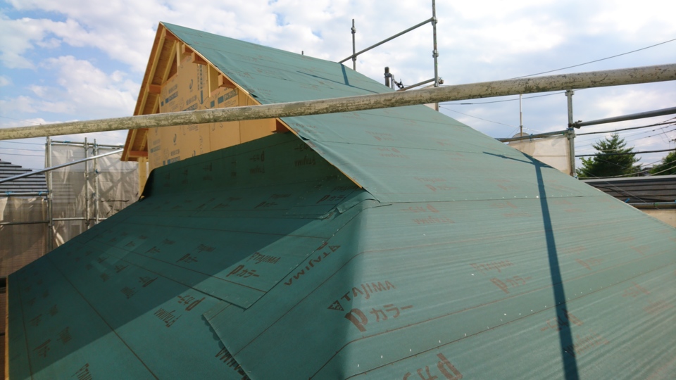 上棟後、大工さんが屋根下地(垂木・野地板)施工しルーフィング敷きを行います。