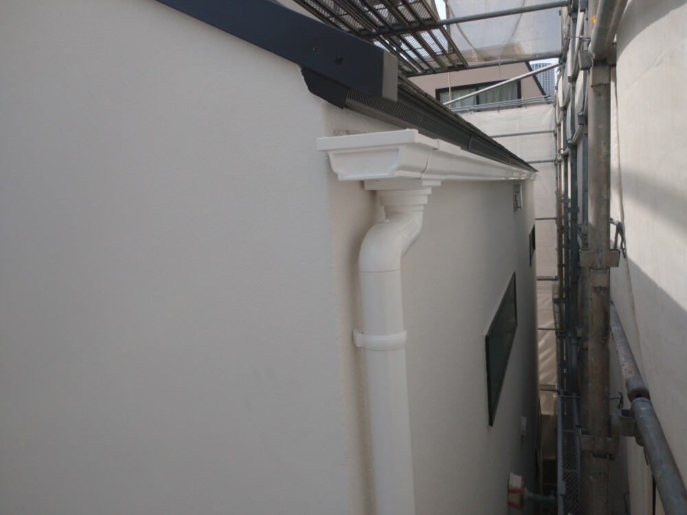 外壁吹付工事が完了したので、雨どいの取り付けを行いました。