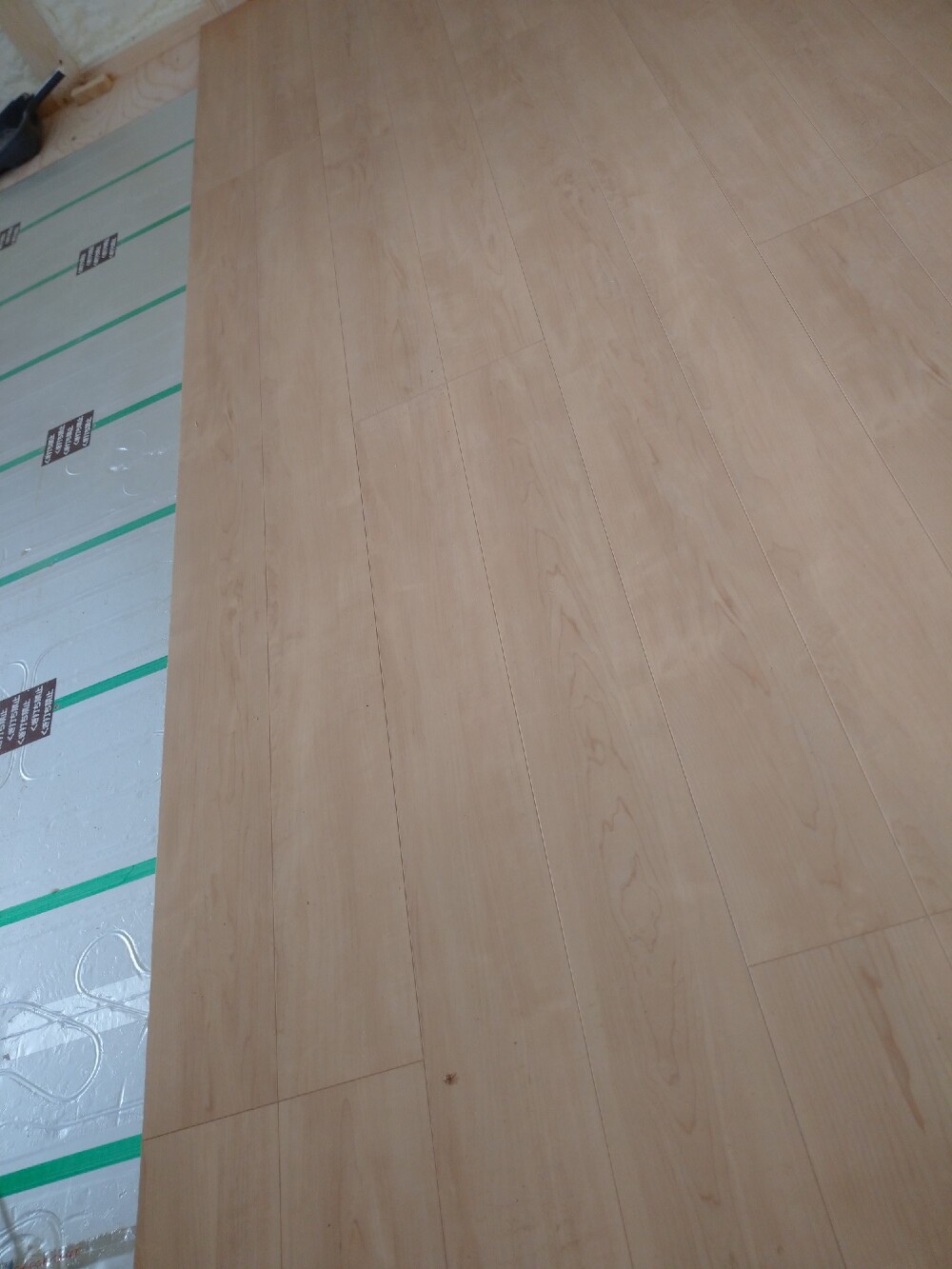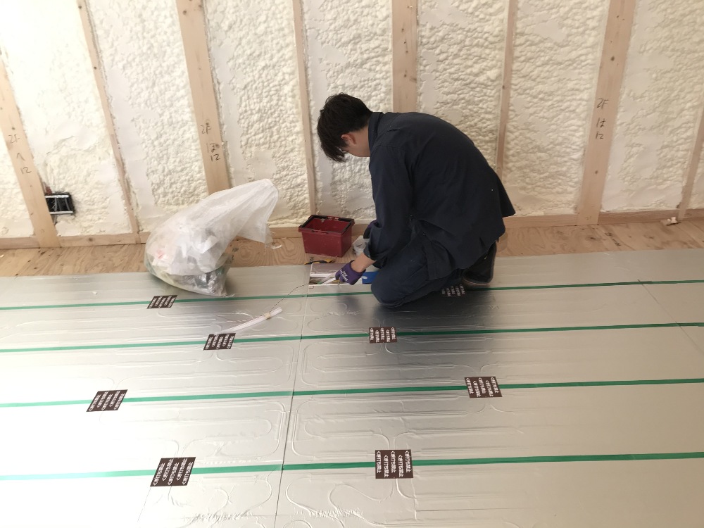 断熱材の充填を終え、床暖房パネルを敷設中です。