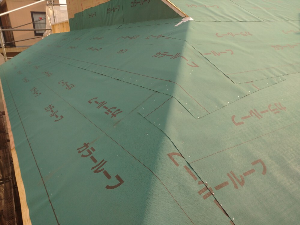 野地板の施工が完了すると、ルーフィング材を敷き込みます。