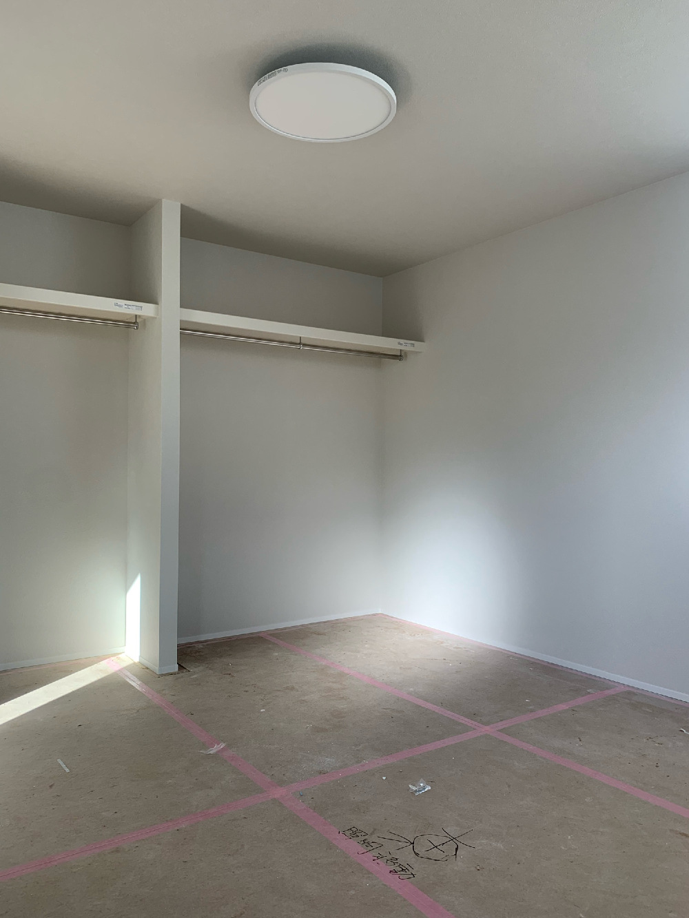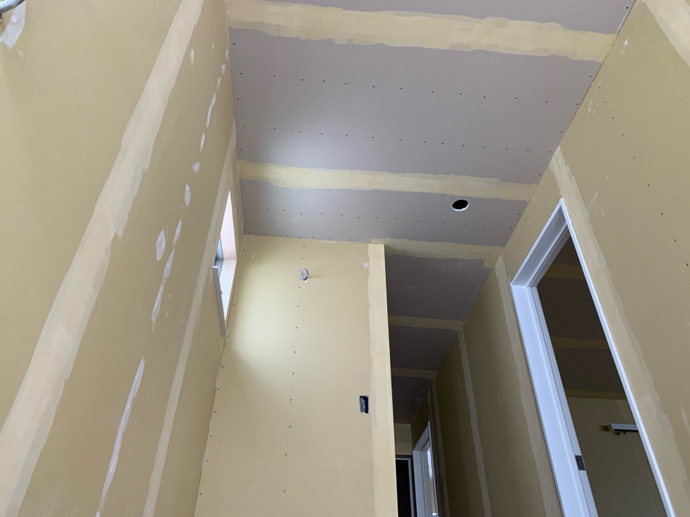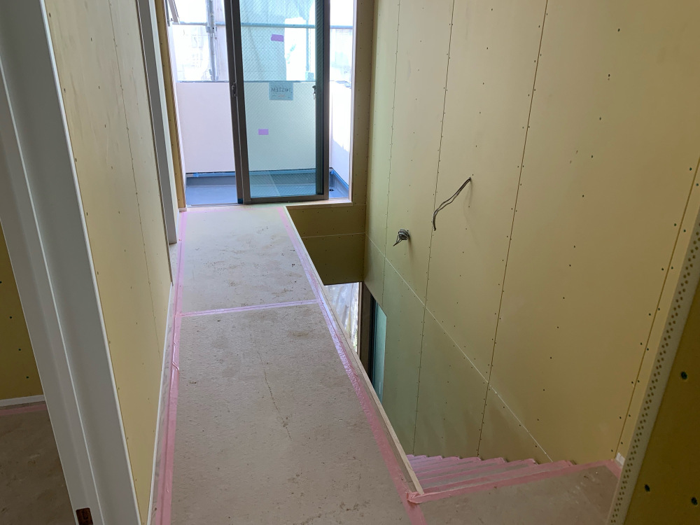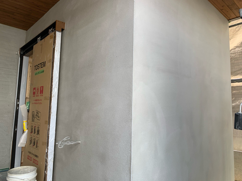 クロスを張る前処理としてボードの継ぎ目やビスのところへパテ処理をし平にする作業を行っています。