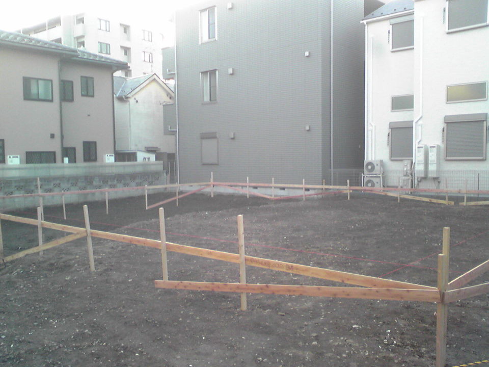 やり方作業とは、工事着手の前に、建物の正確な位置・高さ・水平などを決める作業のことです。ジェネシスでは、複数の現場監督たちでチェックしながら半日強かけて行っています。こちらは作業完了後の写真。
