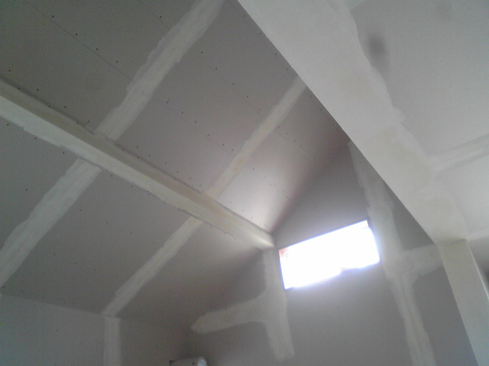 石膏ボードのジョイント・ビスの打ってある部分に下地処理(パテ)を行い、クロスを貼っていきます。この作業により、下地の壁が平滑になり、クロスの仕上がりがきれいになります!