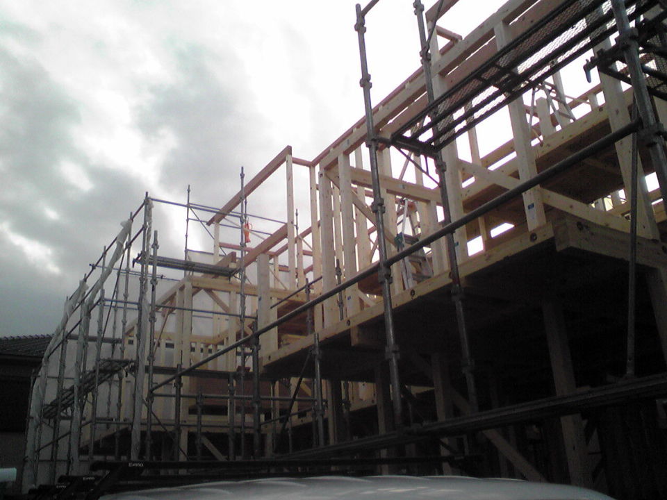 今週は、先行の足場組み立て&大工さんたちによる土台敷きを行います。